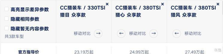 最近我知道,2025款大众CC家族众享款已经正式开售啦,有三厢版和猎装车,总共6款车型,官方定的价格在22.49万到27.49万元,跟2024款价格一样。消息表明,2025款大众CC家族功能配置有变动,还是给消费者提供330TSI和380TSI这两种2.0T动力可选。